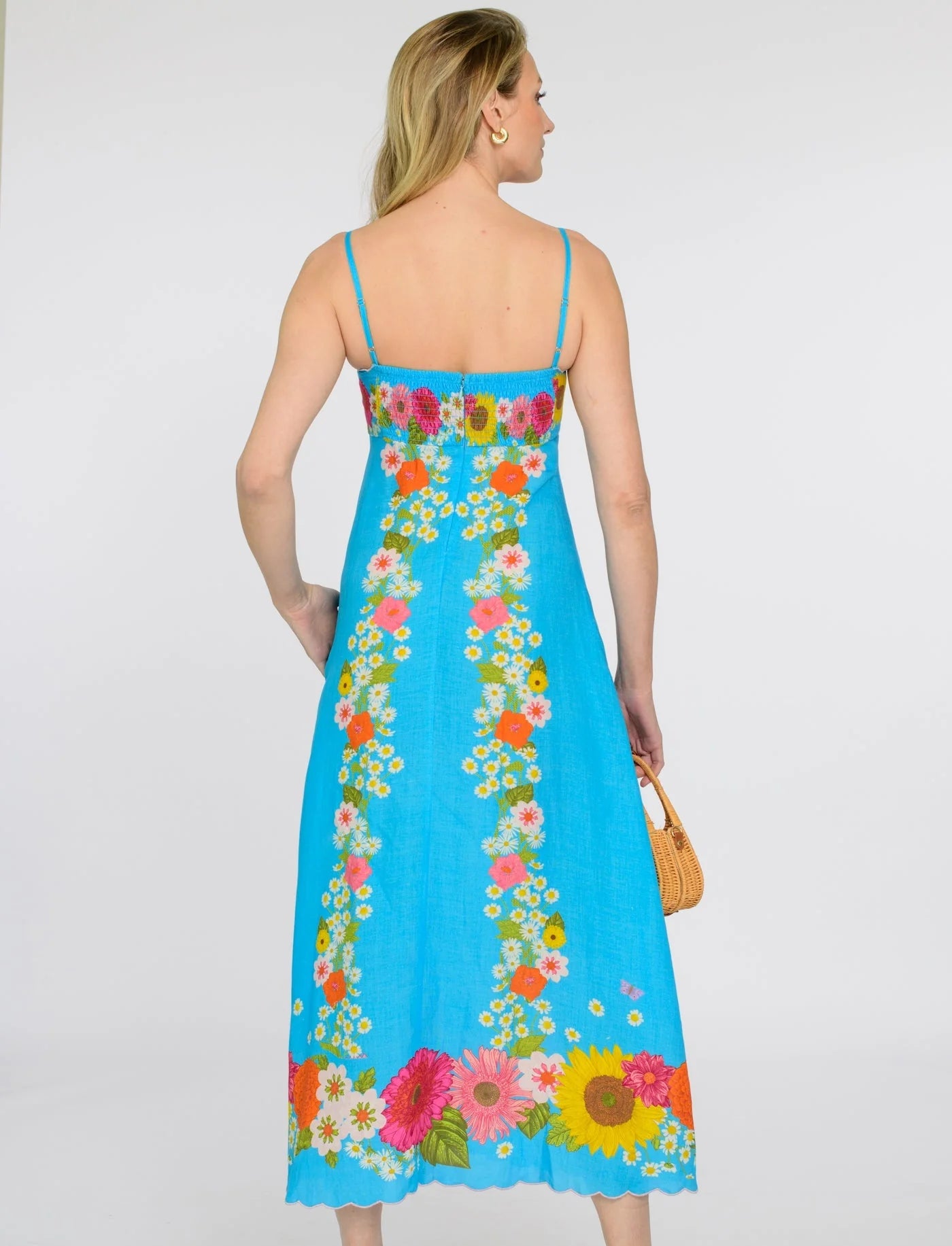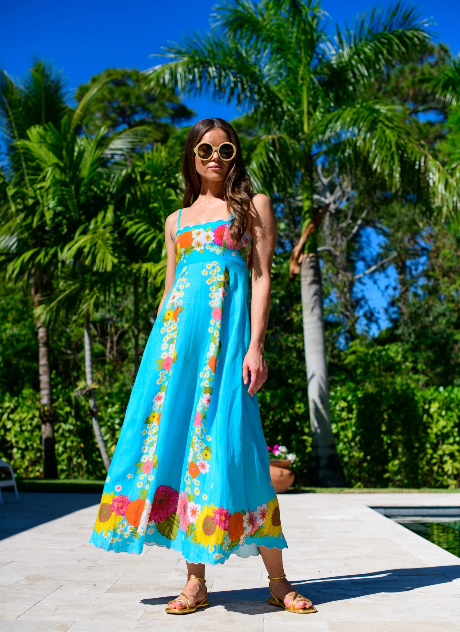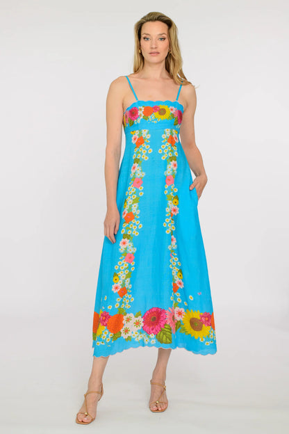 With her fitted empire bodice and flattering paneled skirt, Annalisa is a new favorite silhouette. She looks especially chic in this gorgeous Wildflower Aqua print, elevated with pink scalloped embroidery edges. Adjustable straps and a smocked back offer a comfortable fit for the perfect summer midi dress.