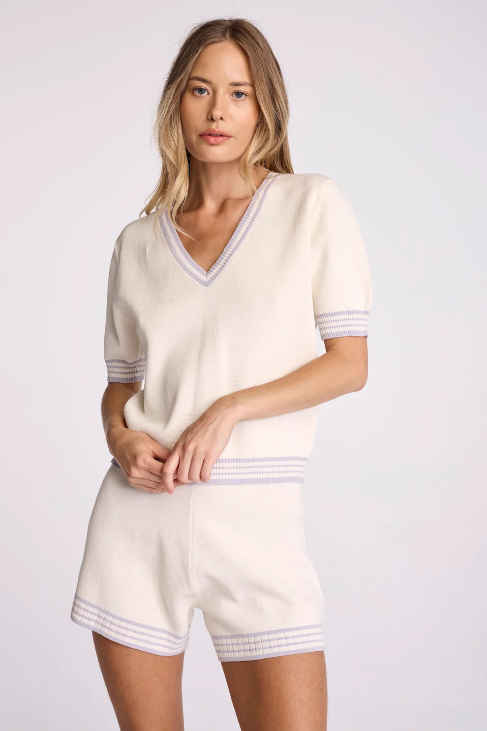 The Anya Shorts are a knit, pull-on style with a zip closure at the center back. Made from 100% cotton knit in a creamy shade, they feature delicate cream petal contrasts at the hem and waistline. These shorts have a more fitted silhouette. Pair them with the Ezra Vest for the perfect set.