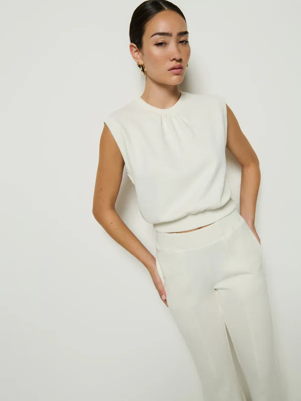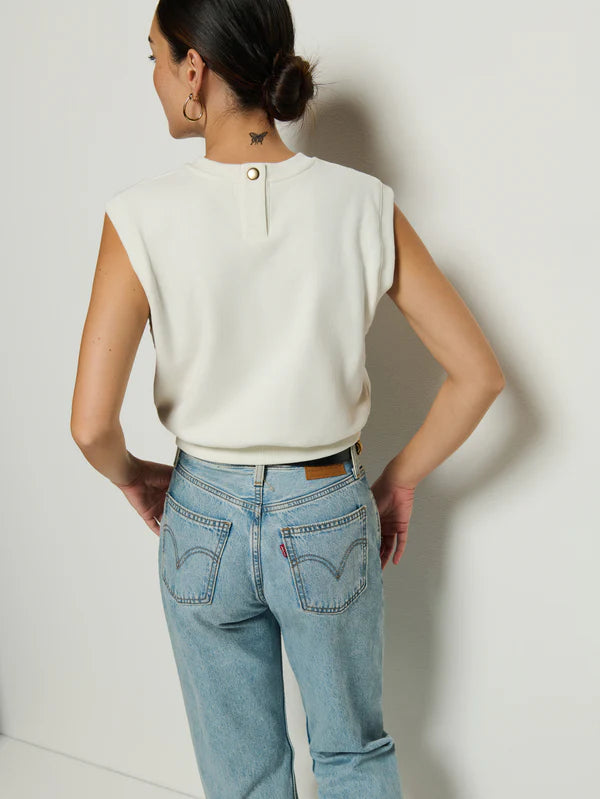 A sleeveless sweatshirt, but make it Nation. Contrast ribbing at the neck and armholes with a cropped, controlled hem, shirring at the neckline for a feminine touch, and of course one of our signature gold buttons at the back. Style tip: pair with your favorite denim or make it a set with our Reece Sweatpant. This one comes in Porcelain.