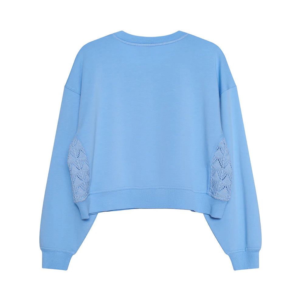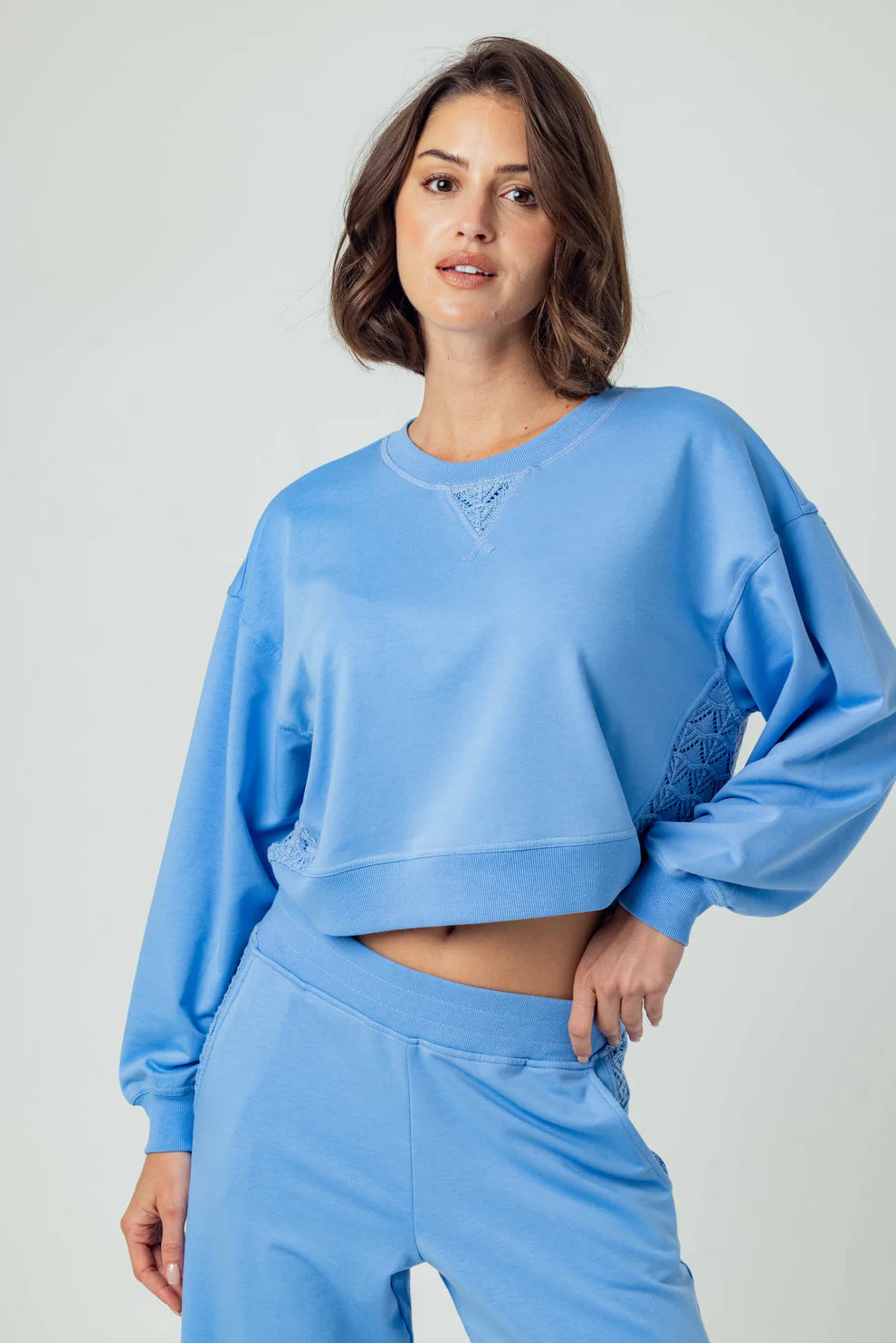Everyone needs a great classic crewneck sweatshirt—meet Coralie. Made from our signature Lux Wash French Terry, Coralie is elevated with crochet insets at the side seams. Pair it with the Mani Pant for the easiest cool-girl sweat set. Coralie is just slightly oversized and cropped to finish at most wearers belly button. Designed to have a slouchy fit, if you prefer a more slimming silhouette we recommend sizing down.