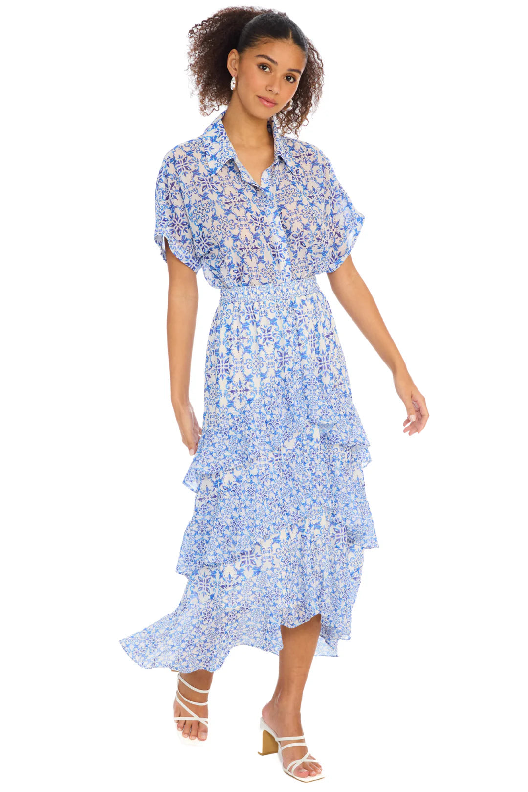 Our Best Selling Ella Skirt is back in a new Grecian Tiles Print. Designed with cascading ruffles and working buttons down the center front. An elastic waist makes for an easy pull-on style. Fully lined. Pairs perfectly back to the Skye Top or mix and match with the coordinating Arlo Tee.