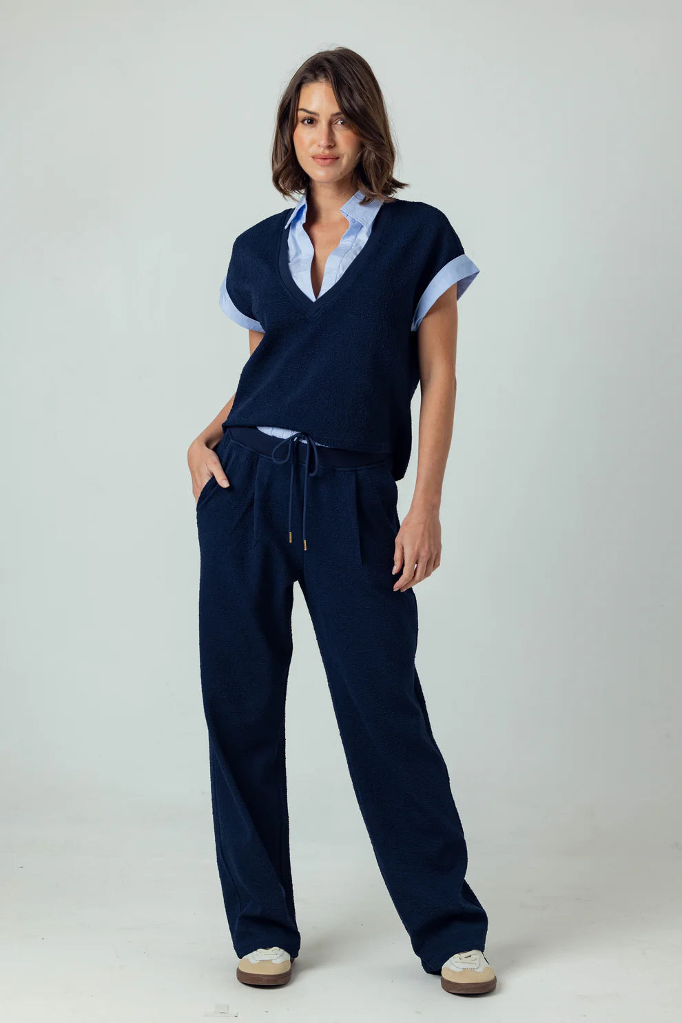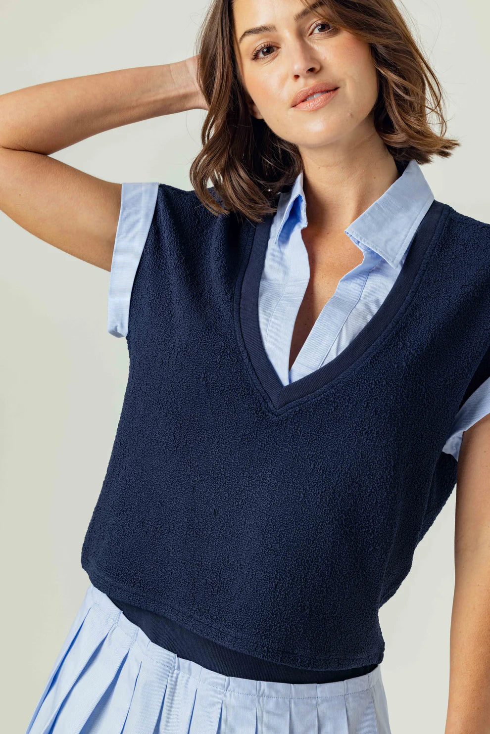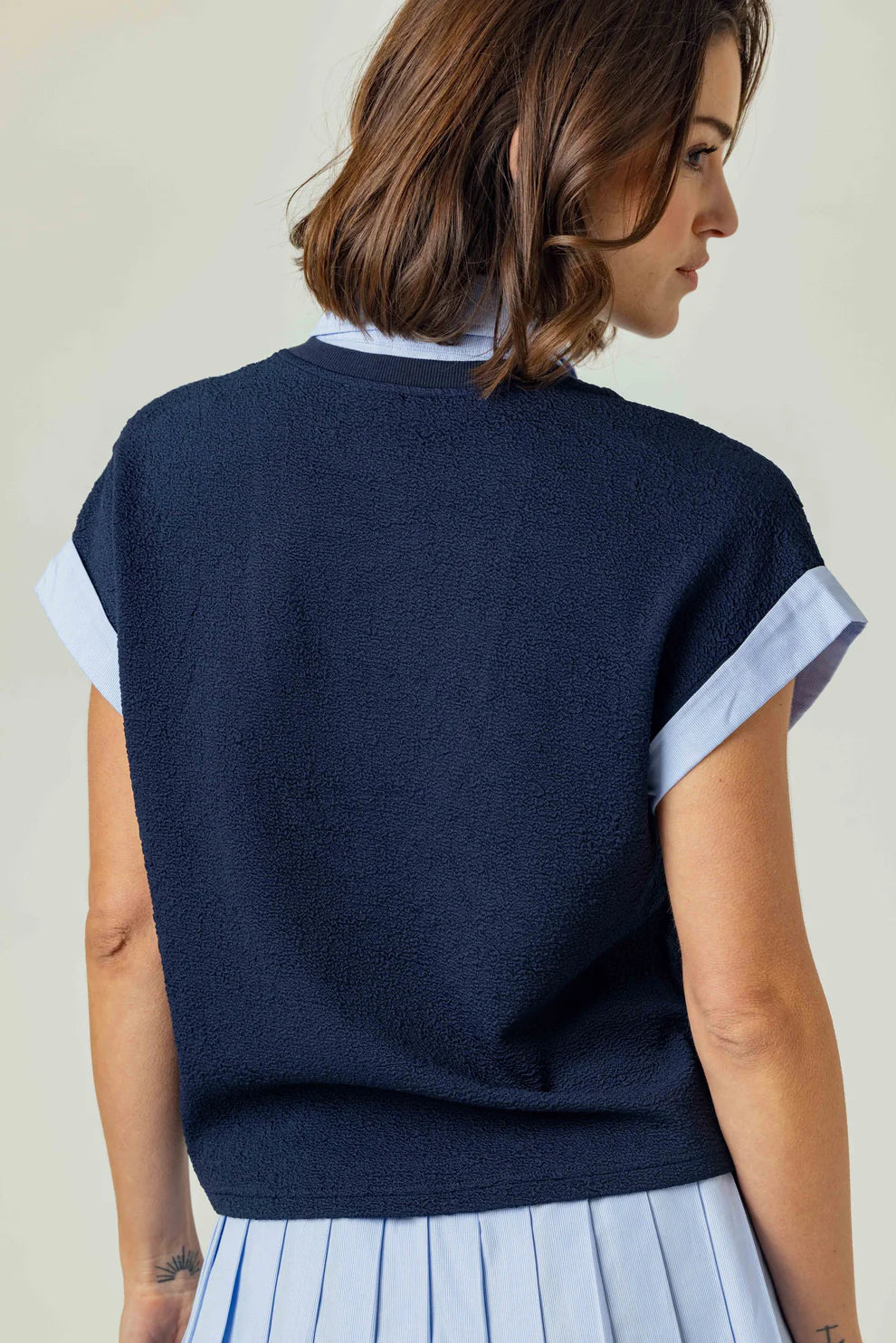 Meet Lune: a mixed-media top designed to look like your favorite crisp poplin shirt layered under a classic v neck. With a v-neckline, boxy fit, and poplin-capped sleeves, it’s made for effortless styling. The perfect length to finish just past the waist of most wearer's, Lune will tuck easily into your favorite high-waisted bottoms. Pair it with the Chantal Skirt for a flirty twist or the Leonie Pant for a more relaxed look.