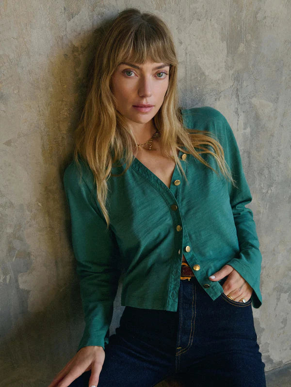 This button-down features a v-neckline, drop shoulders, and a contrast poplin front placket with our signature gold buttons. Practical enough for your day-to-day and special enough for those plans that call for something chic. This one comes in Spruce.