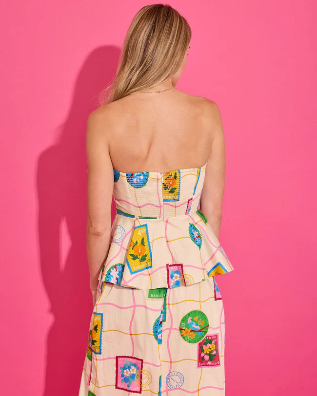 Your new favorite summer top has arrived! The Melissa is a strapless top with a fitted bodice that flares out for a flattering look in our beautiful Postcard print!