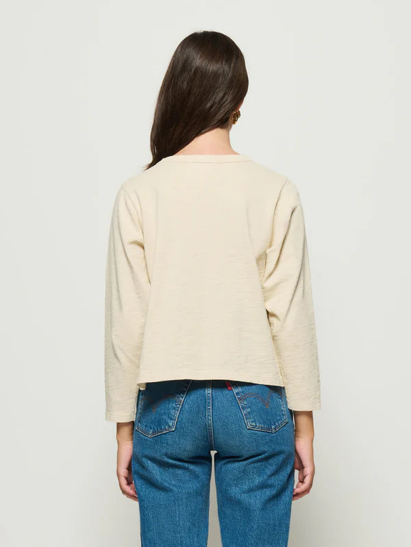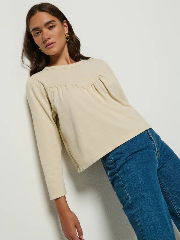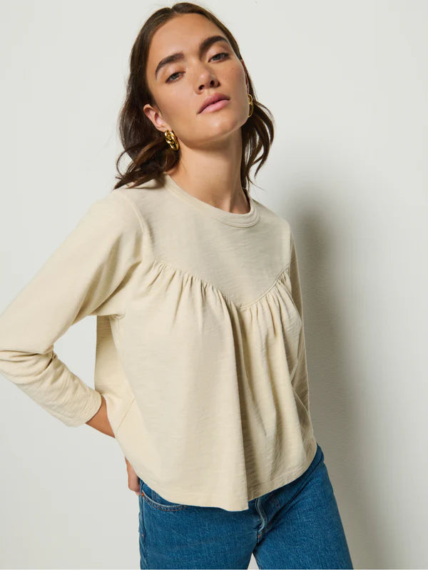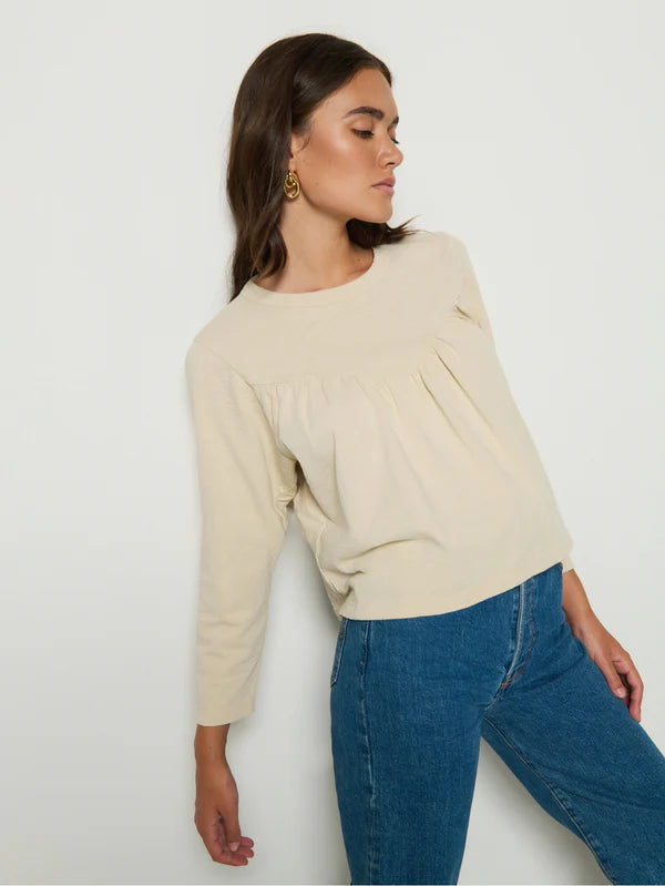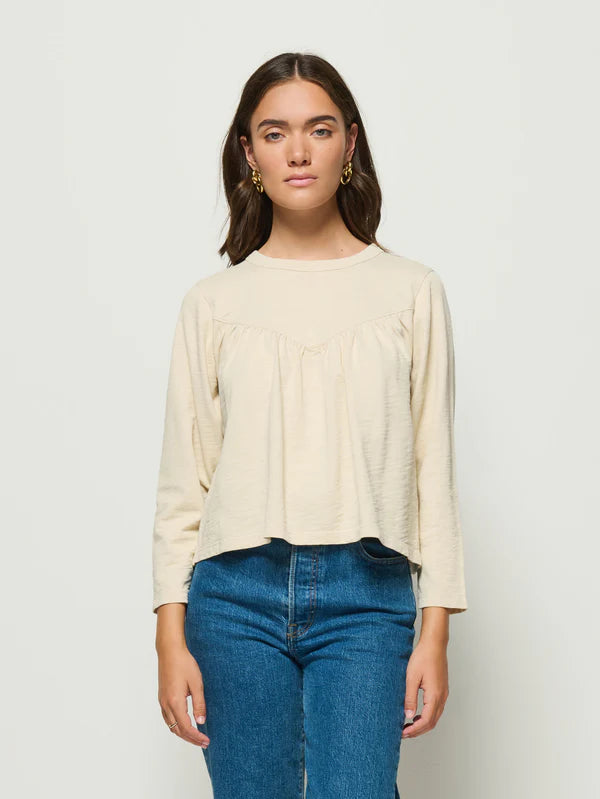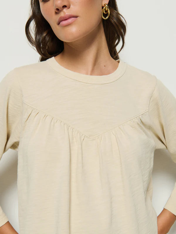 Keep it chic with this crew neck babydoll top, featuring a shirred front yoke and three-quarter sleeves for the ultimate relaxed fit. This one comes in Parchment.