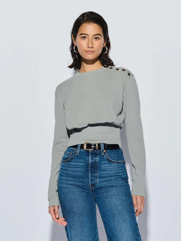We made this one form-flattering and sleek with a ribbed waistband and our signature gold snaps (because you deserve more than a basic long sleeve). (This one comes in Dove Grey.)