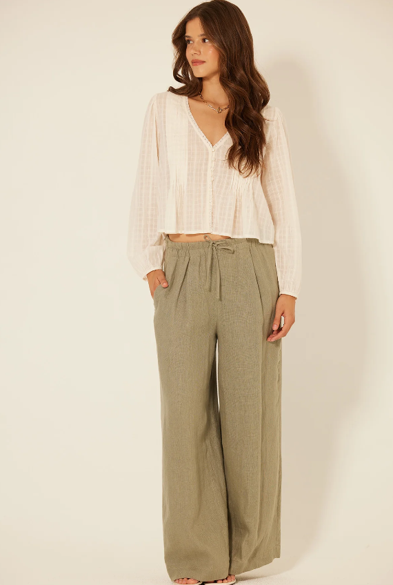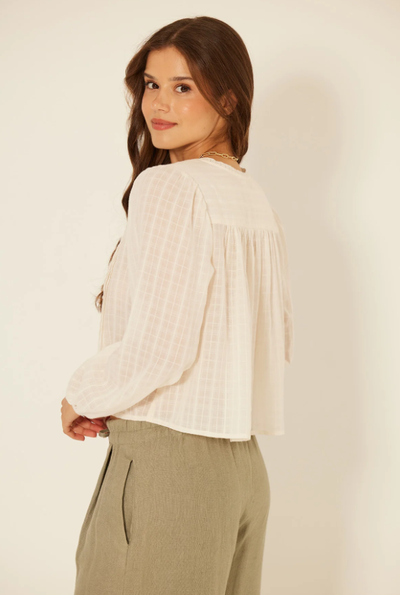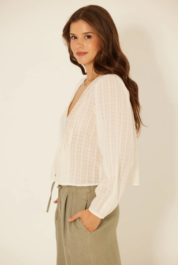 Effortlessly elevate your wardrobe with the Palacios Top! This long sleeve top features unique button and pleat details, adding an extra touch of sophistication to any outfit.