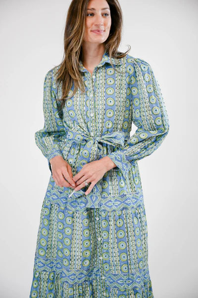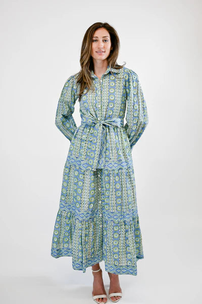 The Rose features buttons down the front, full length sleeves, tiered ruffle skirt, and a matching self tie belt.